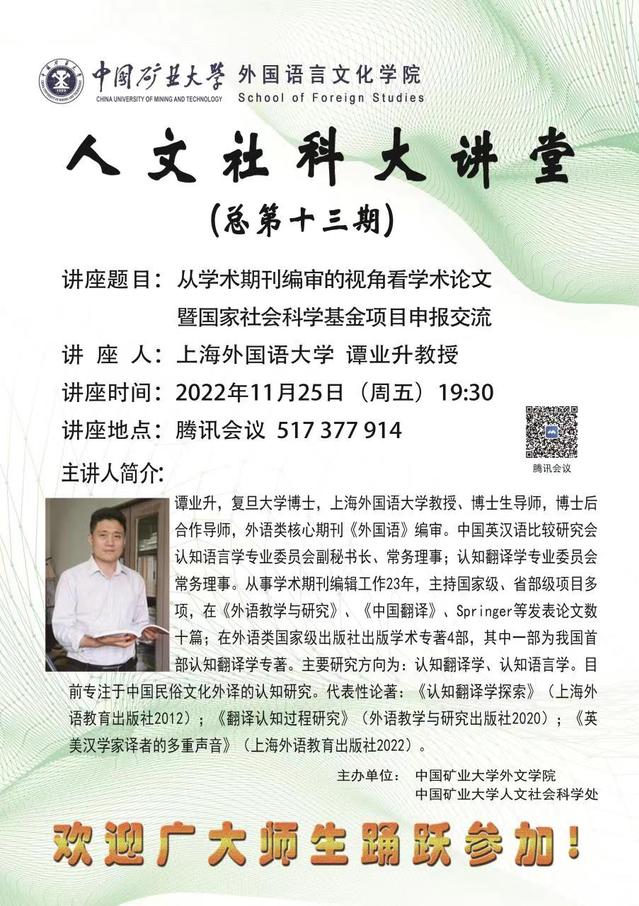 下一条:【人文大讲堂】(2022-14)——翻译研究方法与论文写作纵横谈暨国家社会科学基金项目申报交流